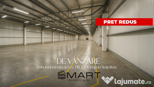 Smart Imobiliare propune la vânzare un spatiu industrial in zona Mall - Selimbar compus din hala productie + birouri astfel : avem la parter o hala de 1200mp cu trifazic putere mare pana la 160kw, pretabila pentru diverse activitati, dotata cu sapa elicpterizata, supraveghere video, alarma, pompe de caldura/racire, acces tir, rafturi etc. La etajul 1,2,3 avem birouri in suprafata de aproximativ 900mp, vestiare, toalete/bai, camere depozitare etc. Spatiul detine autorizatie ISU. Proprietatea are curte , locuri de parcare si este disponibila imediat. Pentru mai multe detalii sunati agentul si precizati la telefon ca ati vazut oferta cu ID : P16614.