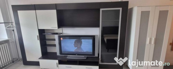 Garsoniera este compusa din living complet mobilat mobexpert: pat matrimonial 160x200, saltea relaxa, canapea, biblioteca, tv 100 cm, masina de spalat Arctic, boiler care asigura apa calda non-stop, combina frigorifica Beko, aer conditionat, fibra optica+tv 150 canale digitale!
