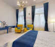 Camera albastră - Spectacol urban oferă o perspectivă dinamică spre strada principală, cu ferestrele originale recondiționate, ce integrează cu eleganță elemente de patrimoniu.