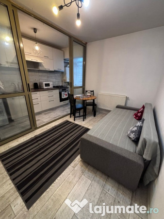Garsoniera este dotata cu usa metalica, centrala termica proprie.Bucataria este dotata cu aragaz,cuptor,hota,cuptor cu microunde, frigider,fierbator.Baia este dotata cu cada,dus si masina de spalat.In camera exista un smart tv, plus o canapea extensibila care se poate transforma intr-un pat incapator.Abonament tv si internet wifi de la digi.