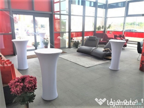 Oferim pentru inchiriere mese cocktail cu huse mulate. Asiguram transport și montaj oriunde in Romania. Preturi avantajoase in functie de cantitate si nr de zile. www.logist.ro 0766142829