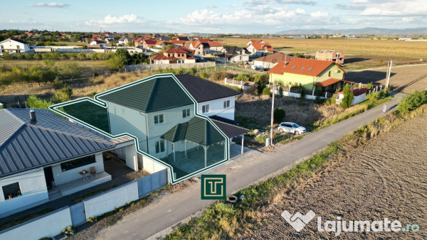 Suprafața construită este de 154 mp, iar cea utilă de 96 mp, desfășurată pe parter, mansardă și pod. Terenul are 342 mp, cu un front stradal de 8 metri și acces direct din drum asfaltat. Compartimentarea este practică și bine gândită: living luminos, bucătărie spațioasă, trei dormitoare, două băi complet funcționale, o terasă acoperită de 7,6 mp, dar și o cameră tehnică situată sub scară, unde se află centrala termică și spațiu suplimentar pentru depozitare și mașina de spălat. În fața casei, proprietarii beneficiază de o parcare acoperită de 18 mp.