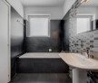 Baia matrimoniala este amenajata cu cada, obiecte sanitare ( vas toaleta, bideu, lavoar) si beneficiaza de fereastra cu aerisire naturala. Grupul sanitar are acces din hol si este amenajat cu obiecte sanitare si dus walk-in.