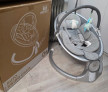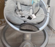 Leagăn electric pentru copii, gri și alb, cu jucării atârnate și funcții de vibrație și muzică pentru a oferi confort și distracție bebelușilor. Este in stare excepțională.