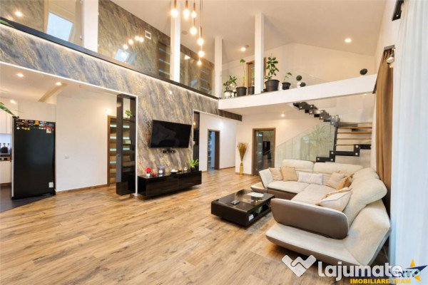 Living spatios tip loft, cu semineu modern si incalzire in pardoseala de ultima generatie;