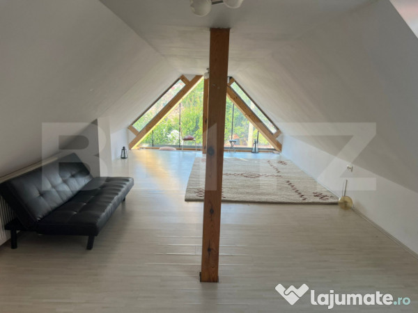 Spațiul este versatil, potrivit atât pentru locuit, cât și pentru birou sau activitate de tip home office. Mansarda beneficiază de lumină naturală pe tot parcursul zilei, iar curtea comună oferă un loc plăcut pentru relaxare.