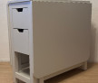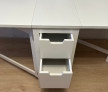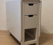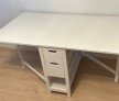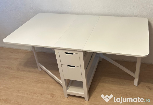Aceasta masa pliabila este o soluție practica și compacta pentru spațiile mici. Masa este în stare buna de utilizare și dispune de patru sertare și o poliță. Dimensiunile sunt: 80/35 cm și extinsă 80/150 cm, cu înălțime de 75 cm
