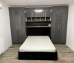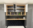 Mobilă de dormitor din MDF complet, cu un pat tapițat.