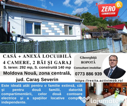 Activ Imob Moldova Noua va propune spre vanzare o proprietate versatila si complet functionala, amplasata in zona centrala a orasului, pe strada Banatului. Este ideala atat pentru o familie extinsa, cat si pentru doua familii, datorita compartimentarii, celor doua contoare electrice si a spatiilor locative complet independente.