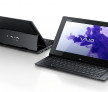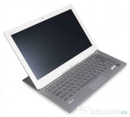 Imaginea arată un laptop de transformare Sony VAIO Fit (probabil un model 13A sau similar). Este un dispozitiv care poate comuta între modurile laptop și tabletă datorită mecanismului său unic de înclinare a ecranului.