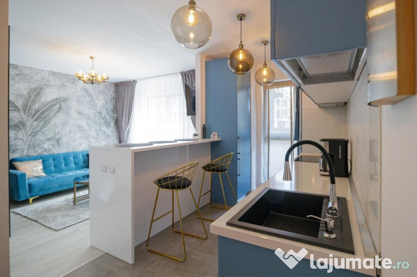 Garsoniera este complet mobilata si utilata, Aer conditionat, incalzire in pardoseala cu centrala proprie, TV smart, cuptor electric cu curatare pirolitica, masina de spalat vase, cuptor cu microunde , cafetiera, masina de spalat rufe, uscator rufe, combina frigorifica incorporabila, pat 180x200, canapea extensiibila, spatii de depozitare.