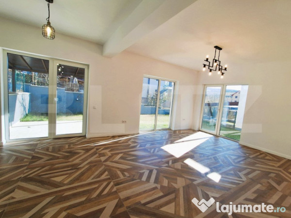 Blitz propune spre vânzare o casă situată în zona Dezmir, având o suprafață utilă de 114 mp și un teren de 444 mp. Casa este dispusă pe 2 niveluri, parter si etaj, oferind o compartimentare practică și eficientă. La parter avem un hol generos ,din care se intra intr-un open space living cu bucatarie, o baie de serviciu, o camera tehnica care poate fi si spatiu depozitare. La etaj sunt situate 3 dormitoare confortabile si doua bai, (dormitorul matrimonial avand baie proprie si dressing). S-au folosit materiale de cea mai buna calitate cu ar fi gresie portelanata 120/60 la parter, gresie portelanata tip parchet 120/20 la etaj, termosistem de 100 mm polistiren, hidroizolatie premium: 3 straturi x 3 mm fiecare ( Bauder ) cu atice si acoperis tip terasa ( placa armata din beton ), tamplarie PVC Rehau cu 3 sticle - izolatie termica si fonica excelenta, centrala termica Viessmann - performanta ridicata, eficienta energetica, termostat inteligent Salus IT 500 Plus - control la distanta pentru confort optim, scari placate cu marmura, intrare placata cu granit, bai complet echipate cu mobilier si robinete Grohe, vopsea superlavabila cu ioni de argint Casa are incalzire prin pardoseala. Se preda finisata,