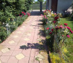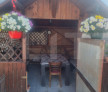 Curte complet pavată, cu foișor din lemn și arbuști ornamentali
