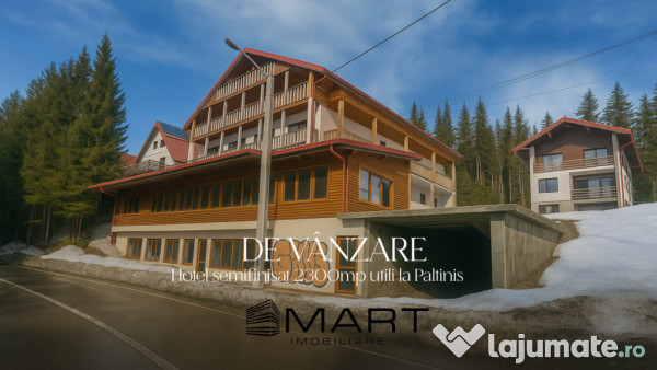 Smart Imobiliare vinde in exclusivitate un hotel situat la Paltinis de 2300mp utili + teren 500mp, la un super pret de doar 350€/mp. Cladirea este inceputa si este in stadiul semifinisat, are un imens potential, pregatita pentru hotel, cu 25+ camere, sala de conferinte, receptie, terasa+restaurant si multe altele. Imobilul este pretabil si prentru un centru de recuperare varstnici, fiind multe camere pentru a fii pregatite in acest sens. Accesul este foarte facil, sunt locuri de parcare +30 pentru acest imobil. Pentru mai multe detalii si informatii despre aceasta proprietate sunati agentul si precizati la telefon ca ati vazut oferta cu ID:P15211