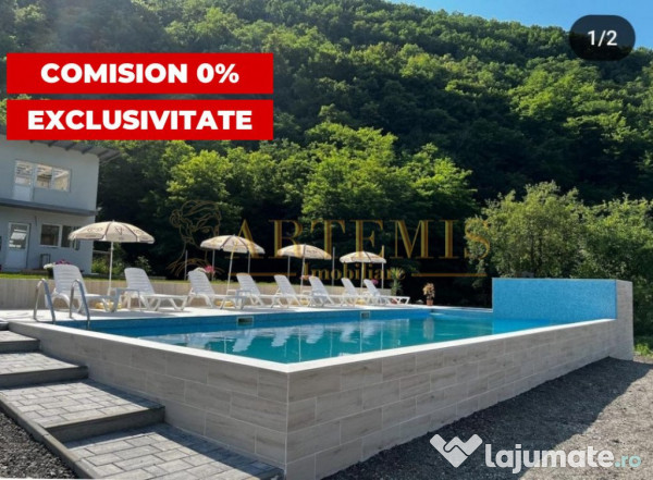 Artemis Imobiliare vă oferă spre vânzare, pensiune spațioasă și luminoasă de 4 camere, piscina ,terasa cu curte si gradina la marginea paduri în sat Lungesti nr.3 jud. CLUJ-NAPOCA. Imobilul este construit pe o parcela de teren in suprafata totala de 5418 mp, are regimul de inaltime P+1, avand o suprafata utila de 230 mp, terasa de 300 mp, piscina de 92mp, teren liber de 4752mp, fiind compartimentat astfel: Parterul este compus din: 1 camera cu baie proprie, 2 bai si un dus cu intrare din exterior si bucatarie. Etajul este compus din: 3 dormitoare fiecare cu baie proprie si balcon iar terasa este pavata. Vă așteptăm la vizionare! ID extern: P93478