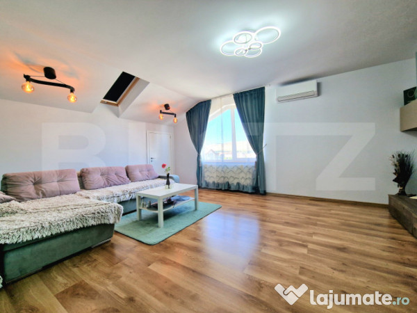 Situat la mansardă, etaj 4, al unui bloc central din Florești, aproape de magazine non-stop, farmacii, bănci, stații de autobuz, piață, etc.