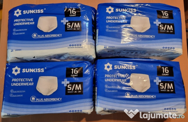 Pachetul contine 4 seturi de chiloti absorbanti pentru adulti, marimea S/M (talie intre 66-86 cm), nivel de absortie moderat (vezi desenate 2.5 picaturi), unisex.
