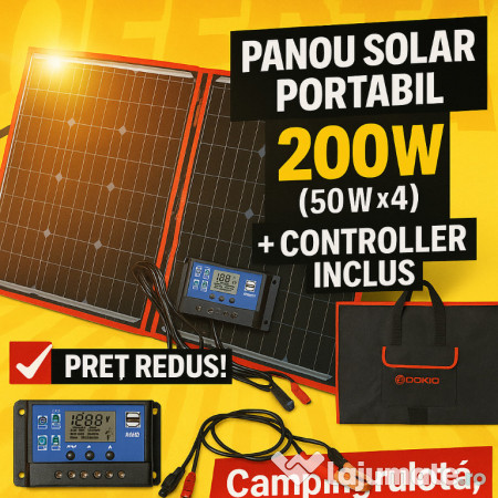 Vrei energie oriunde – rapid, eficient și fără bătăi de cap? Iată soluția: panou solar portabil monocristalin 200W (50Wx4) cu controller inclus, perfect pentru camping, pescuit, barcă, rulotă, off-grid sau locuințe fără acces la priză!