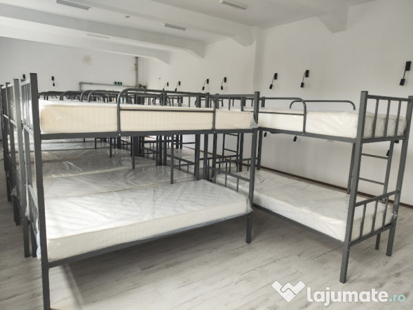 Pat etajat metalic, robust și fiabil, ideal pentru economisirea spațiului în dormitoare colective confecționat din țevi și profile groase (2-1,5 mm) cu suportul de saltea (somieră) complet metalica, din profile sau platbande sudate perimetral, cu o rezistență de 200-300 kg, avand prindere în șuruburi (8 șuruburi/somieră).