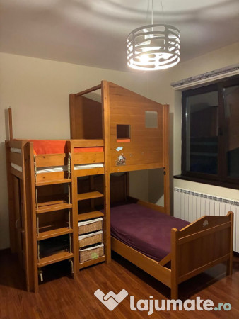 2 paturi suprapuse, fabricate din lemn de pin, import Germania, dispuse sub forma de "L" avand atașate un dulap si rafturi. Dimensiunea paturilor este de 90x200cm. Se vând cu somiere si saltele ortopedice in stare foarte bună.
