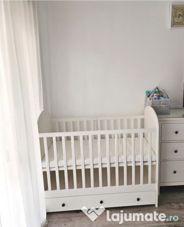 Pătuț nefolosit, din lemn masiv și MDF, cu sertar generos și saltea neutilizată. Somiera reglabilă pe 2 trepte de înălțime, laterală detașabilă.