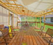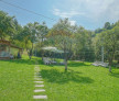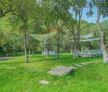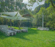 Curte amenajată cu zone de grătar, bar, șezlonguri și hamac