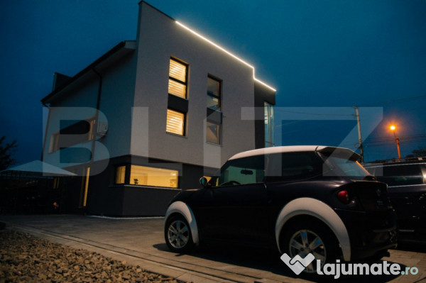 Exclusivitatea si rafinamentul acestei proprietati sunt accentuate si de fatada exterioara moderna la fel si de interiorul conceput de un designer recunoscut. Proprietatea este pe regim de P+1E+M desfasurata astfel: