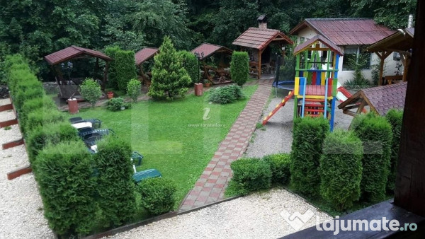6 camere duble, 3 camere superioare, 1 apartament cu bucatarie proprie și intrare separată. Pensiunea mai dispune de 1 foisor inchis (incalzire, Tv ), acces la rau din curte, si 1 foisor 16 persoane cu gratar, inca 3 foisoare a cate 6 persoane pe malul paraului, living 1 (sala de mese de 80 mp), living 2 (35 mp, 16 locuri), 2 Lcd, bucatarie utilata( 2 chiuvete, 2 aragazuri, cuptor microunde, toaster, filtru de cafea, fierbator, frigider); incalzire centrala, apa calda non-stop; curte amenajata cu alei si gazon, sezlonguri, imprejmuita cu gard, iluminata, parcare iluminata; loc de joaca pentru copii compus din complex de joaca(turnulet, topogan, rampa de catarare, groapa nisip+accesorii, 2 leagane-unul cu sistem siguranta bebe) trambulina, balansoar, topogan, casuta, 2 gratare. Spatiile comune sunt supravegheate video.
