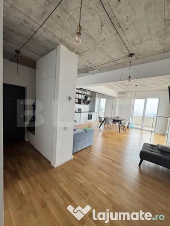 Compartimentarea este practică și echilibrată, incluzând living cu bucătărie și dining open-space, două dormitoare și două băi, una cu cadă și cealaltă cu duș walk-in.