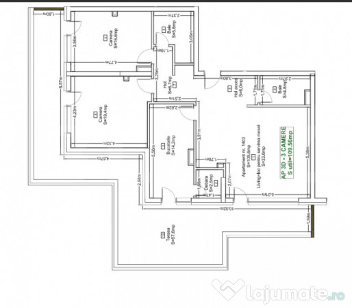 Apartamentul are o suprafață utilă de 109,7 mp și beneficiază de o terasă generoasă de 56,70 mp, , ideală pentru relaxare în aer liber și priveliști panoramice la apus.