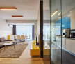 O bucătărie închisă cu perete de sticlă, complet echipată, cu acces direct la balcon – locul perfect pentru cafeaua de dimineață