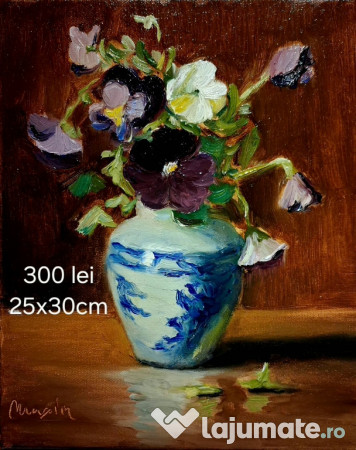 Flori în vază pictură realizată pe pânză întinsă pe șasiu de lemn. Tehnică impresionistă în ulei vopsele de calitate. Pictura este data cu vernish ptr o mai bună rezistenta în timp. Transportul inclus în preț.