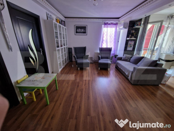 Apartamentul se afla amplasat intr-un bloc din caramida izolat termic la exterior, bloc situat la mica distanta de mijloacele de transport in comun si puncte comerciale de interes(Profi, farmacie, Mariflor, Oncos, Panemar, librarie, magazin de legume si fructe, gradinita, etc.). Imobilul dispune de centrala termica proprie, tamplarie PVC cu geam termopan, aer conditionat si este compus din: hol, living cu bucatarie open space, camara, 2 dormitoare, baie si balcon. Locul de parcare este optional si se poate achizitiona la pretul de 4.000 euro. Pentru mai multe detalii nu ezitati sa ne contactati.