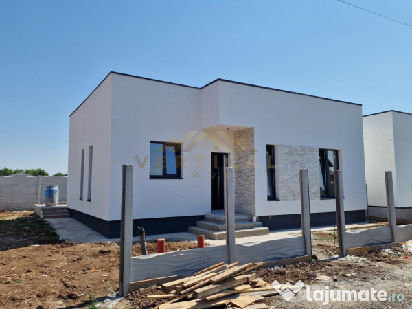Casa este desfasurata pe un singur nivel , cu living cu bucatarie deschisa , iesire pe terasa , 2 dormitoare dintre care unul cu baie proprie si o baie de serviciu,