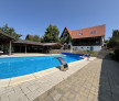 Piscina exterioara, cu zona de sezlonguri si vedere catre lac