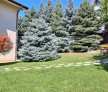 Curtea este un adevărat colț de relaxare, perfect întreținută, cu gazon verde, terase pavate și spațiu suficient pentru piscină.