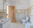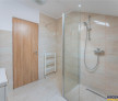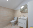 - la parter avem living cu bucatauml;rie open-space, din care se face si accesul pe terasa, dormitor/birou, baie cu cada, spatiile auxiliare, apoi scara interioara care ne poarta spre etaj, unde avem doua dormitoare, deservite de o baie cu dus walk in.