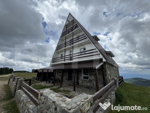 BLITZ vă propune spre vânzare o proprietate cu potențial turistic deosebit, situată în zona Vârful Roman din Horezu, județul Vâlcea, la o altitudine de 1.720 m, cu o priveliște spectaculoasă spre Mănăstirea Alina Maria. Construită în anul 2013, casa are o suprafață utilă de aproximativ 660 mp și este desfășurată pe demisol parțial, parter, două etaje și mansardă, având un total de 14 camere cu băi proprii, completate de spații tehnice și funcționale.