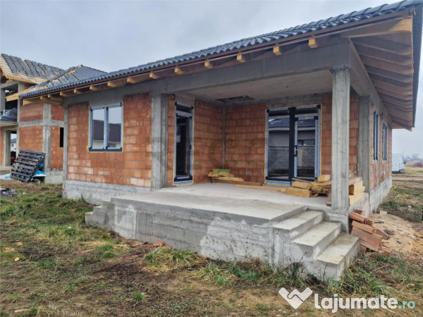 Un hol , 3 dormitoare , 2 bai , un dresing , bucatarie cu living open space si o terasa in partea din spate a casei . Dormitorul matrimonial are baie si dresing propriu . .Casa este echipata cu ferestre si usi din PVC cu 7 camere si sticla tripan, asigurand un plus de confort termic si fonic , instalatia electrica este trasa si interior este semifinisat , asa cum reiese din poze