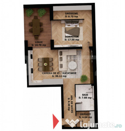 Dormitorul impresionează printr-un dressing generos tip walk-in, perfect organizat și elegant, în timp ce livingul și bucătăria modernă formează un ambient primitor, ideal pentru momente de relaxare sau socializare.