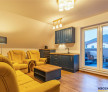 Living armonios asezonat in tonuri calde si o bucatarie open space.
