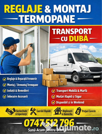 Ofer servicii profesionale de reglaj , montaj și reparații termopane, precum și transport marfă cu dubă, la prețuri corecte.