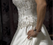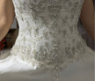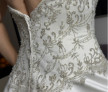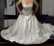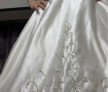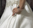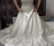 Rochie de mireasă Signature, model elegant și foarte bine lucrat. Rochia are material satinat, broderie bogată cu mărgeluțe și aplicații fine pe bust și pe partea frontală a fustei. Broderia iese în evidență și pe trenă. Trena are aproximativ 1,5 metri, îți oferă un efect spectaculos când mergi.