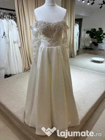 Rochie de mireasa noua, realizata pe comanda. Rochia este noua, nu a fost purtata, doar probata. Se vinde doar in Iași, pentru a putea fi probată. Toate detaliile despre dimensiuni sunt in ultima poza. Se potriveste pentru o persoana slabuta, inaltimea de 1,55cm cu tocuri de 7-10cm.