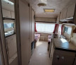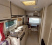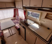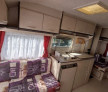 in partea din faţă are doua banchete si o masa care se transforma in pat mare pentru 2 persoane, iar în partea din spate are doua bancute si o masa care se transforma in pat pentru 1 persoana si se mai poate deschide un pat supraetajat pentru un copil (vezi in pozele de mai jos) , se separa de restul rulotei printr-o usa armonica culisanta .
