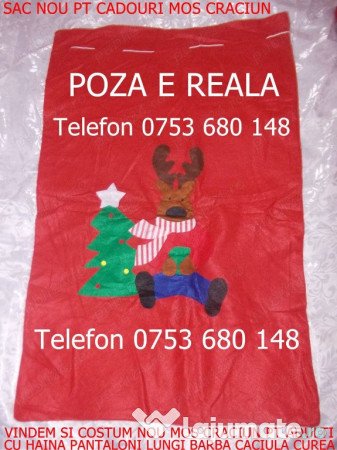 LA PRET REAL SI FIX 39 Lei, PACHETUL COMPLET cu SAC MARE PENTRU DAR, CADOURI, INALTIMEA SACULUI UN METRU, CULOARE ROSU PENTRU CADOU, SI COSTUMUL MOS CRACIUN CU HAINA, BARBA, PANTALONI, CACIULA, CUREA.