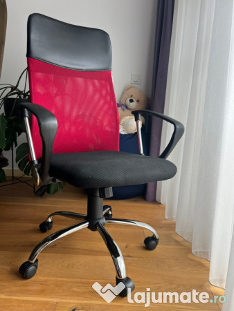 Vand scaun de birou ergonomic negru/visiniu. Scaunul este utilizat, dar în stare bună de funcționare, potrivit pentru a fi folosit în cadrul unui birou sau acasă.