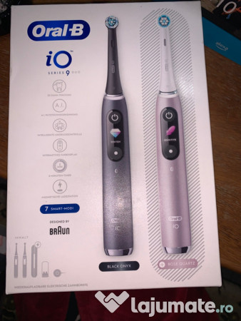Setul conține două periuțe de dinți electrice Oral-B iO Series 9 Duo, în culorile Black Onyx și Rose Quartz.