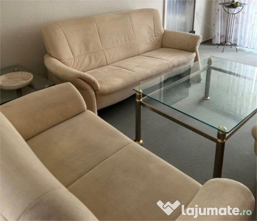 Setul de canapele este în stare foarte bună. Acesta include o canapea de 3 locuri , o canapea 2 locuri și un tamburel tapițate în culoare bej. Mobilierul are un aspect îngrijit și elegant, tapiteria Lamous 1850/40 natur este de o calitate foarte buna , fara pete sau zgarieturi !