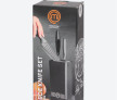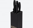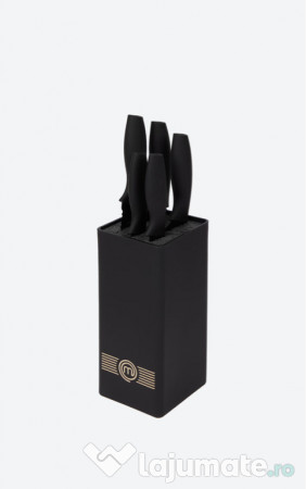 Cuțitele sunt depozitate într-un suport vertical negru, cu un sistem interior tip perii, care permite introducerea cuțitelor în orice poziție și protejează lamele.